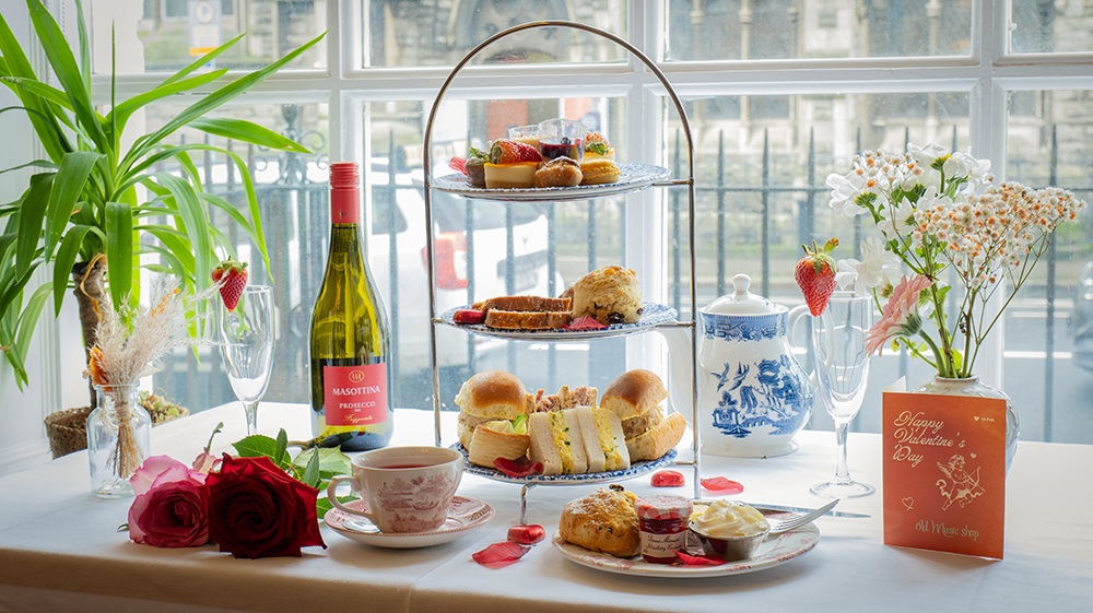 A romantic Afternoon Tea featuring savoury classics, indulgent desserts, and a bottle of Prosecco.